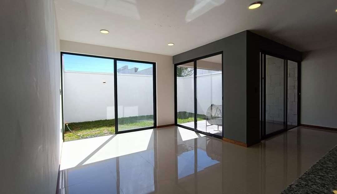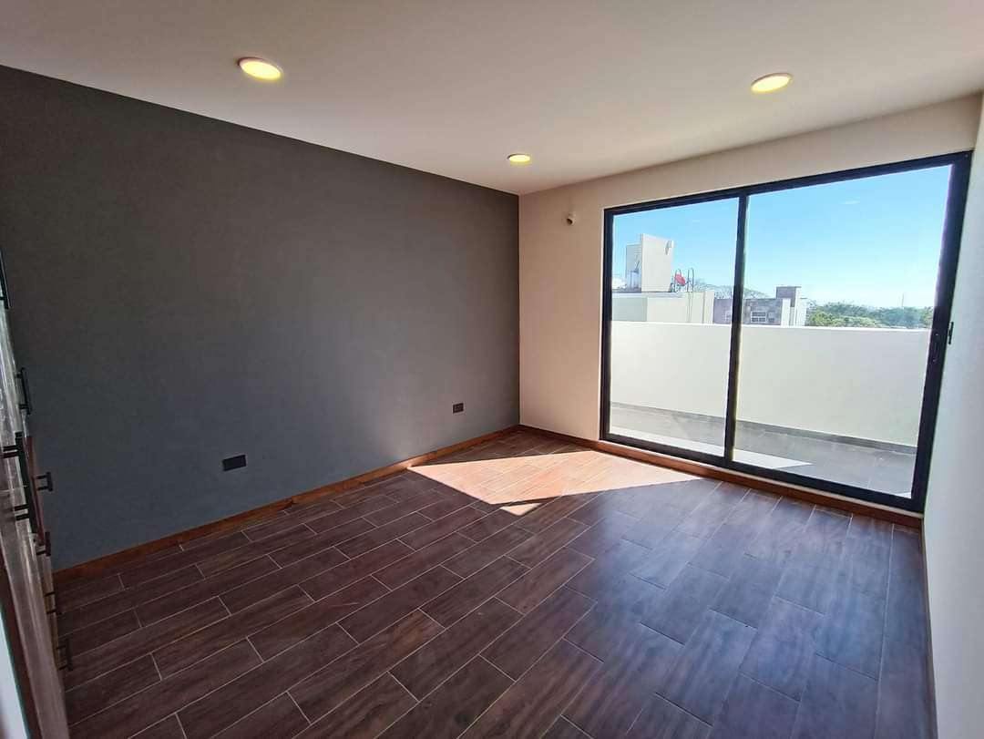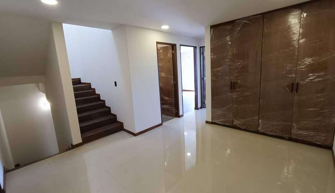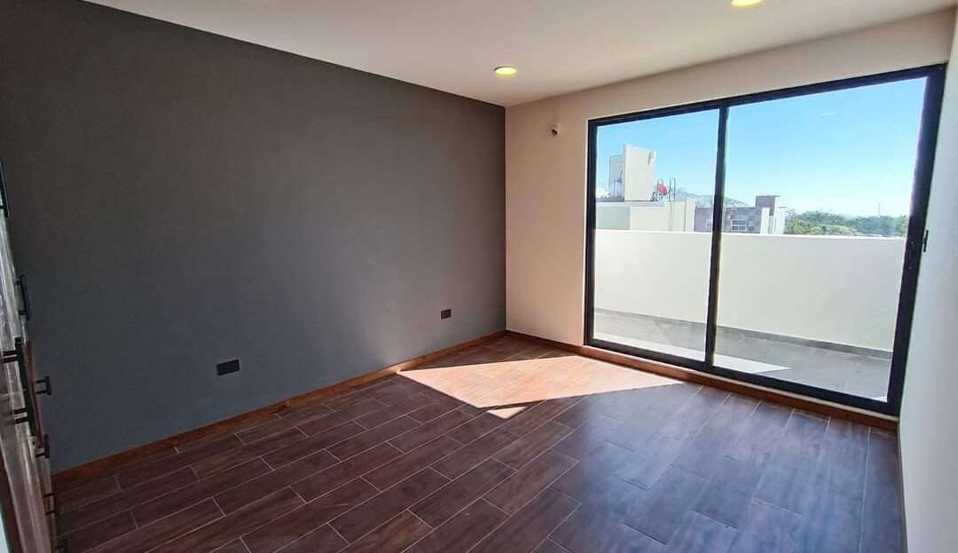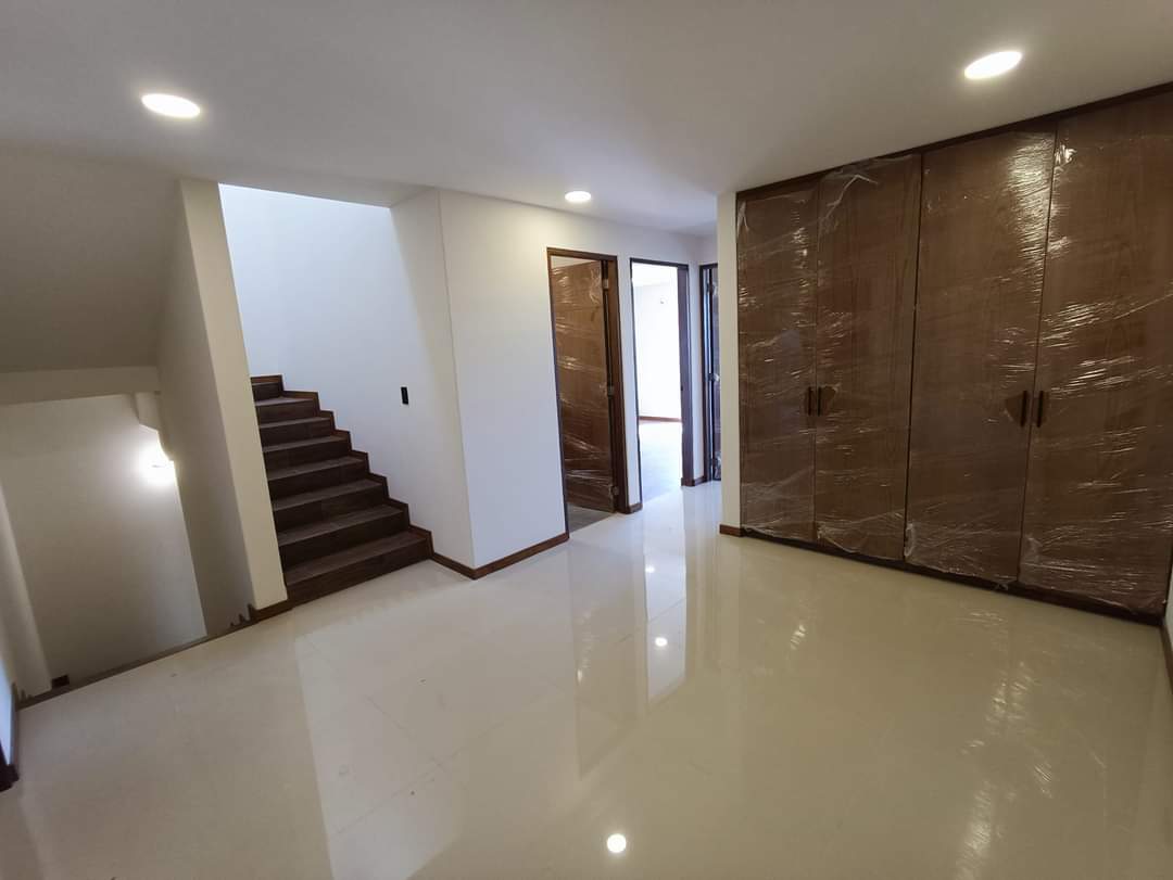 La planta alta alberga la recámara principal con una pequeña terraza, vestidor y baño completo con cancelería de cristal templado. Dos recámaras secundarias con closet comparten una terraza con vistas al jardín. Complementa esta planta una sala de TV, closet de blancos y un baño completo.